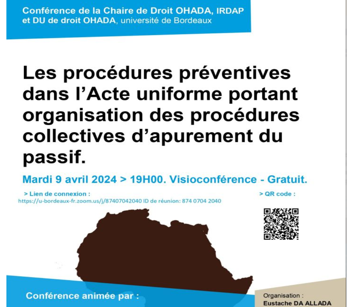 La Chaire de droit OHADA, IRDAP et le D.U. Juriste d'affaires OHADA et de l'intégration régionale africaine de l'Université de Bordeaux ont le plaisir de vous convier à une conférence en ligne, qu'ils organisent le mardi 09 avril 2024 à 19h.